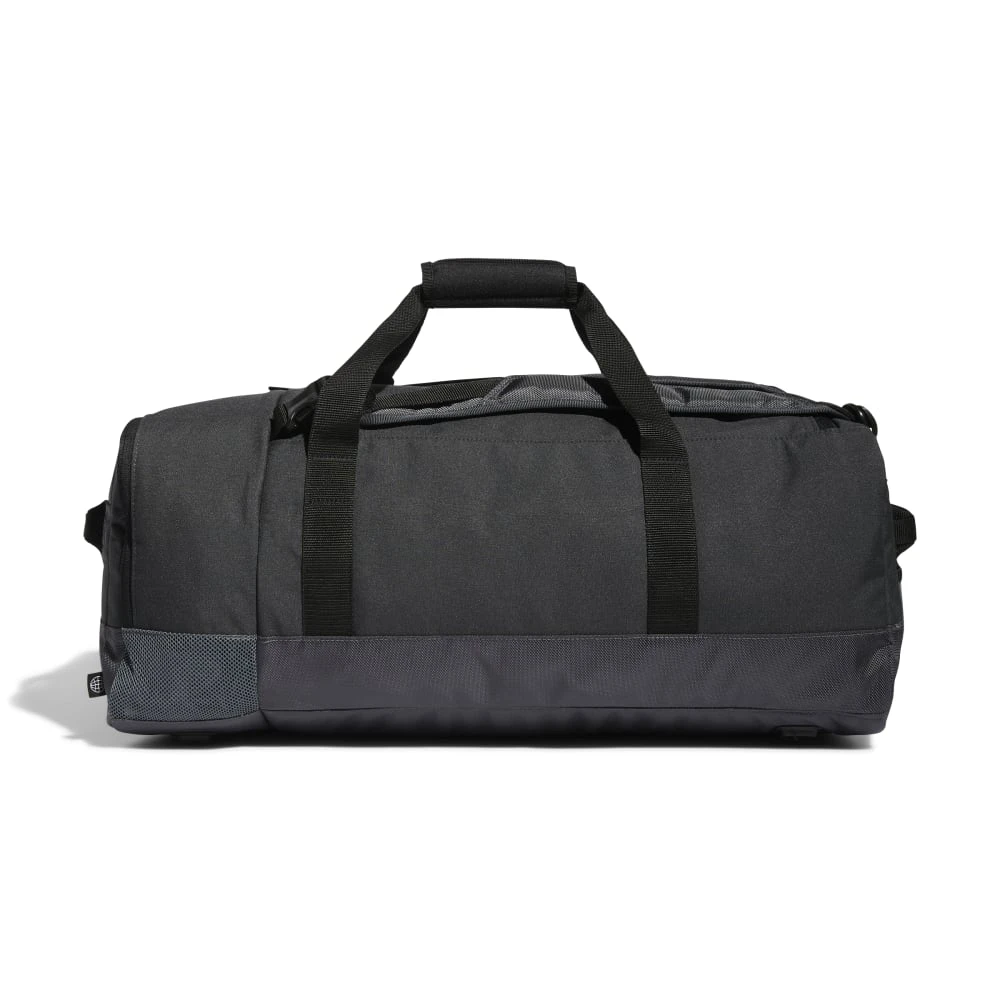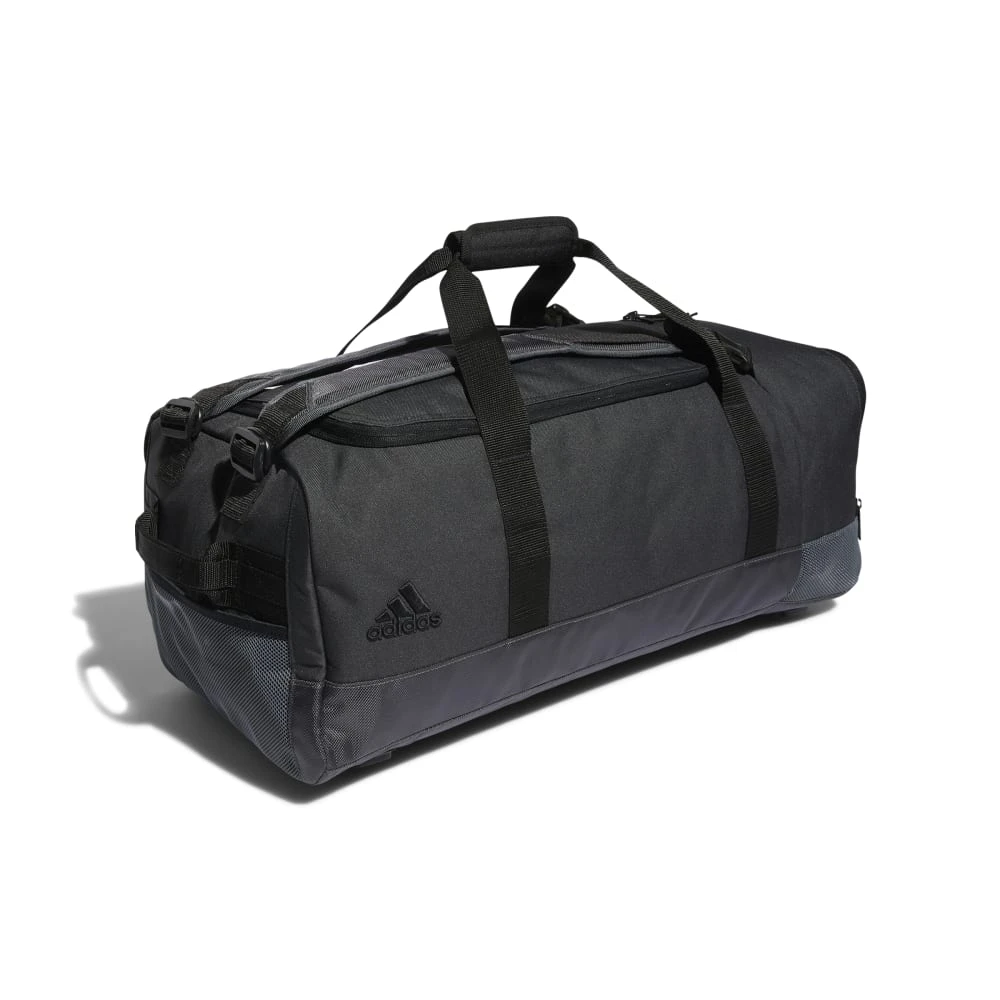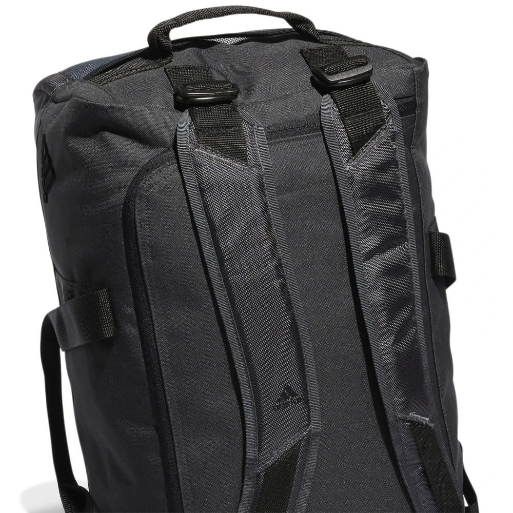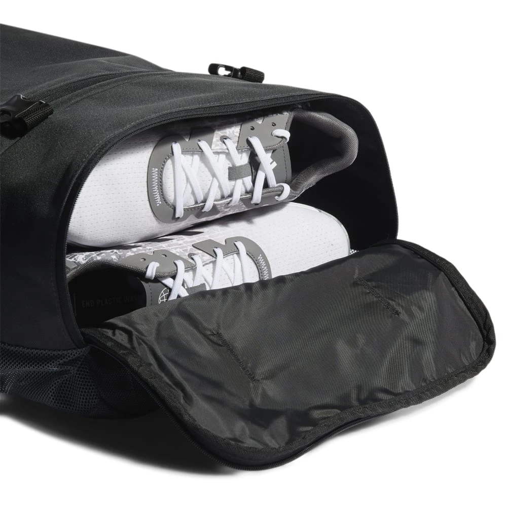 “Keep your golf gear in one place. This adidas duffel bag is roomy enough for your pants, gloves and even some spare balls for the golf course. Put your shoes in the dedicated vented pocket when you’re done playing. Adjustable shoulder straps let you carry it like a backpack, or you can remove them altogether and use the padded handle for a more conventional approach.” Made in part with recycled content generated from production waste, e.g. cutting scraps, and post-consumer household waste to avoid the larger environmental impact of producing virgin content.”