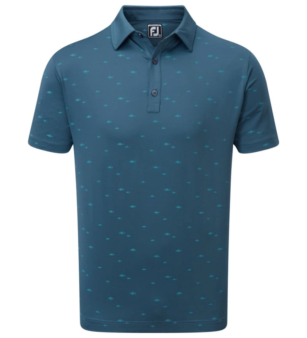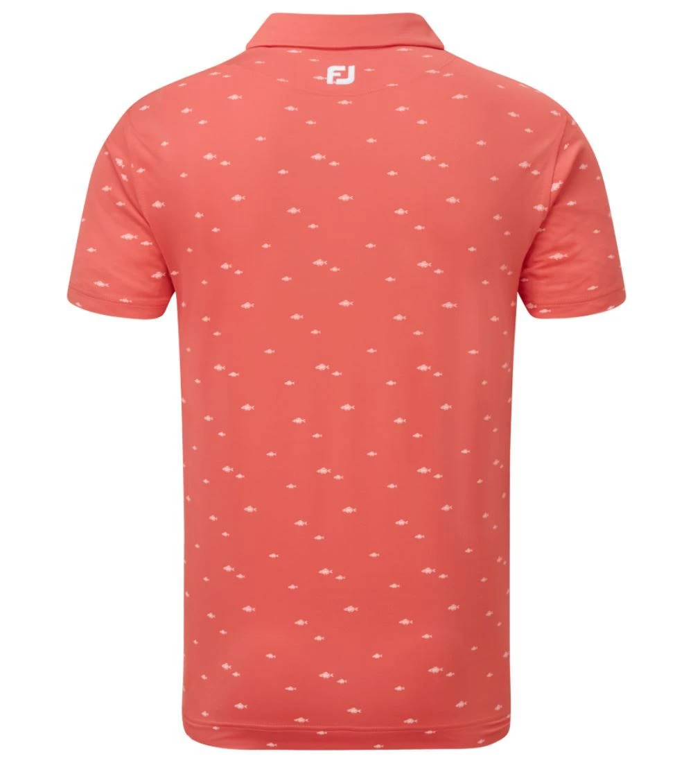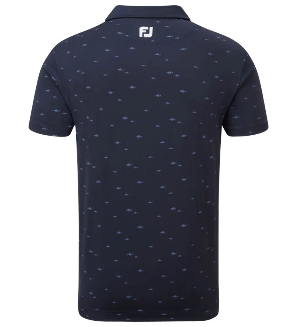 FJ ProDry Lightweight Stretch Lisle fabric. All over tonal fish print pattern. Contrast rear yoke FJ logo. Moisture wicking technology draws moisture away from the body. Easy care fabric to minimise wrinkling. SPF 30 UV protection